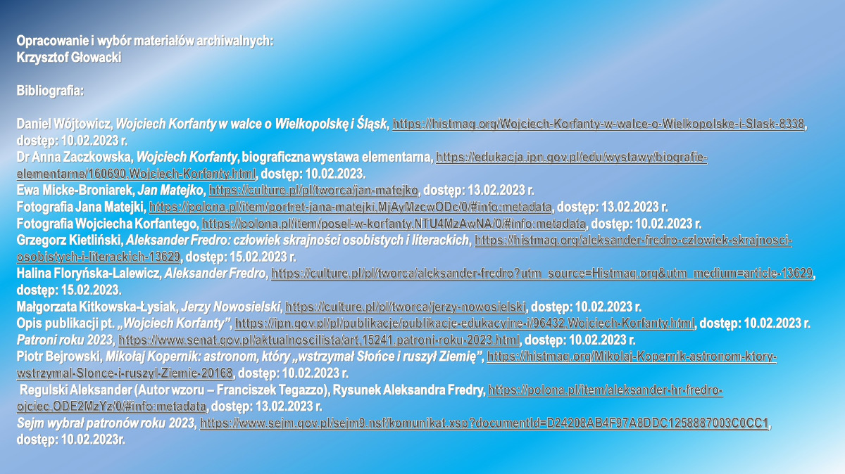 Polski parlament, wzorem lat poprzednich, ustanowił patronów 2023 r. Znaleźli się wśród nich m. in.: człowiek renesansu, a przede wszystkim astronom Mikołaj Kopernik, wybitny malarz Jan Matejko, niezwykły artysta Jerzy Nowosielski, polityk i patriota Wojciech Korfanty oraz komediopisarz Aleksander Fredro.