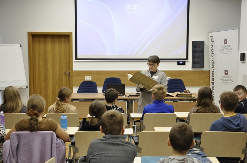 Lekcję archiwalną przeprowadziła Pani Irena Mazur-Kusio. Zaprezentowała wybrane archiwalia oraz kopie interesujących dokumentów z zasobu Archiwum Państwowego w Radomiu oraz ze zbiorów własnych. Omówiła rodzaje dokumentacji i dobre warunki ich przechowywania. Przybliżyła uczniom zawód archiwisty i jego zadania. Na zakończenie goście zostali obdarowani drobnymi upominkami oraz obejrzeli wystawę pt. „Radom nie do poznania”, która dostępna jest dla każdego odwiedzającego w godzinach pracy Archiwum Państwowego w Radomiu.