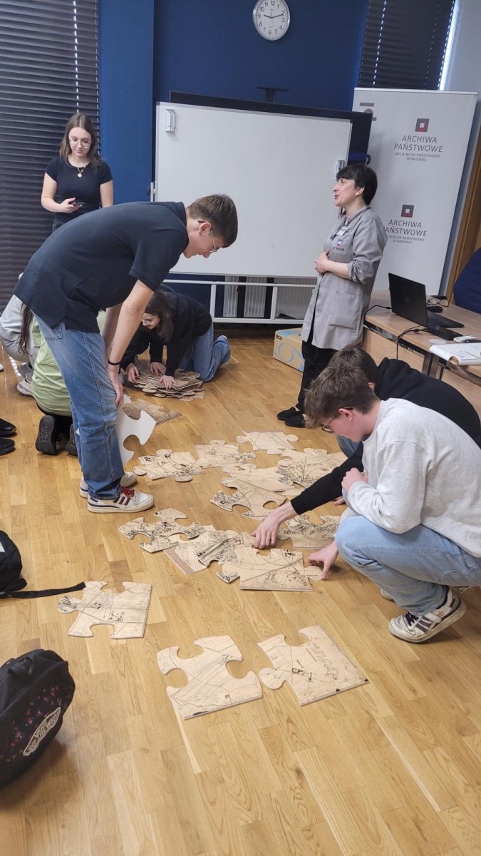 Na zakończenie dwie grupy chętnych uczniów rywalizowały o to, kto szybciej ułoży puzzle XXL, na których widnieją dwie mapy Radomia z lat 1824 i 1925. Każdy uczestnik lekcji archiwalnej otrzymał nasze materiały promocyjne.