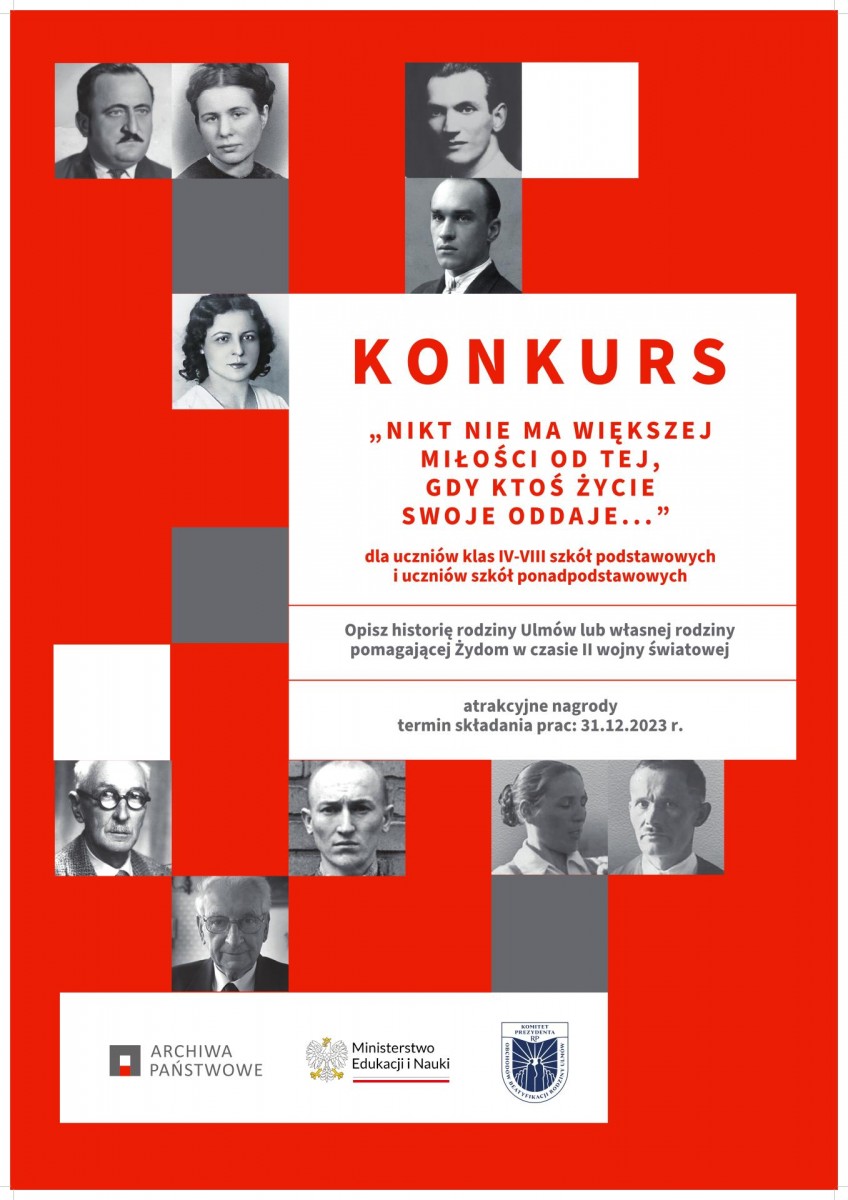 13 września 2023 r. Naczelna Dyrekcja Archiwów Państwowych ogłosiła konkurs „Nikt nie ma większej miłości od tej, gdy ktoś życie swoje oddaje…”.Współorganizatorem jest Ministerstwo Edukacji i Nauki. Konkurs jest skierowany do uczniów klas IV-VIII szkół podstawowych i uczniów szkół ponadpodstawowych. [...]