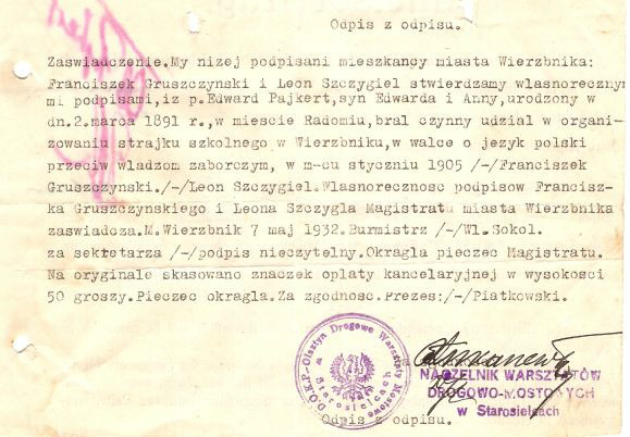W Wierzbniku Edward wraz z rodziną zamieszkał w jednopiętrowym domu przy ul. Krótkiej 8, w pobliżu Rynku. Otworzył tam kolejną w swym życiu piekarnię. Ponieważ 27 marca 1906 r. zmarła jego żona Anna Ludwika, w rok później ożenił się po raz trzeci. Jego wybranką została Franciszka Teresa Szenuar – siostra zmarłej Anny Ludwiki, urodzona 27 lutego 1870 r. w Piotrkowie Trybunalskim. Po śmierci Edwarda, zmarłego w Wierzbniku 22 marca 1912 r. w wieku 73 lat, Franciszka wyszła w roku 1924 za Antoniego Klemensa – ślusarza, mieszkańca Radomia. Po pewnym czasie oboje wyjechali do Starosielc koło Białegostoku, do mieszkającego tam syna Edwarda Pajkerta – Edwarda Józefa. Franciszka zmarła 21 kwietnia 1952 r. i została pochowana na lokalnym cmentarzu.