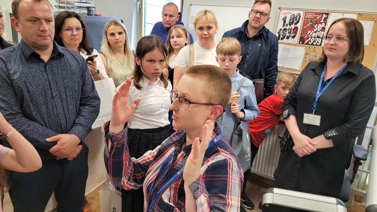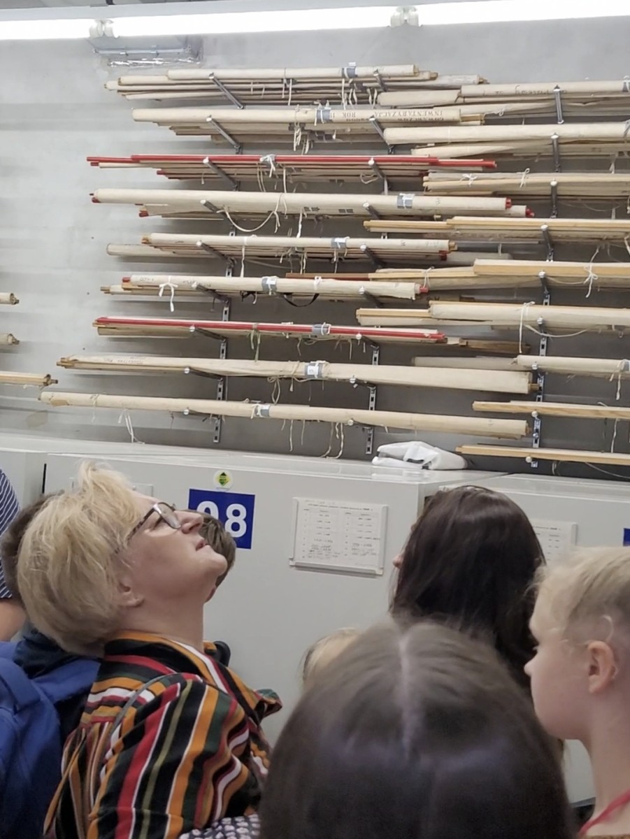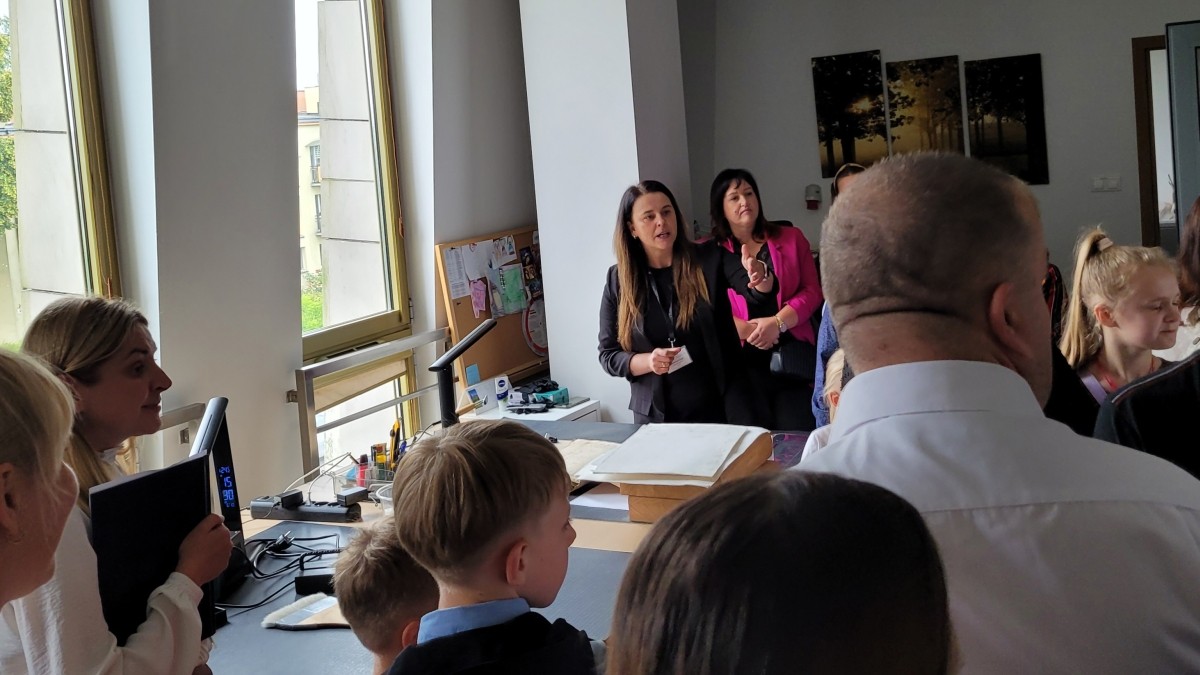 Następnie oprowadziliśmy gości po najciekawszych zakątkach naszej siedziby. Razem z kierowniczką Oddziału II Aleksandrą Nosowską zajrzeliśmy na półki i regały nowoczesnych magazynów, gdzie opowiedziała o przechowywanym wieczyście zasobie. Odwiedziliśmy pracownię, w której konserwatorka Katarzyna Grzyb pokazała narzędzia, którymi operuje na co dzień ratując uszkodzone dokumenty. Na koniec zwiedzania, sprawdziliśmy w pracowni digitalizacji, jak szybko Pani Dominika Korłup obsługuje skaner, dbając o najlepszą jakość kopii cyfrowych materiałów archiwalnych. To właśnie Pani Dominika wykonała skany nagrodzonych i wyróżnionych prac, które w najbliższym czasie opublikujemy na naszej stronie w formie wystawy cyfrowej. Dzieła Laureatów będą również zdobiły kalendarz ścienny na rok 2025.