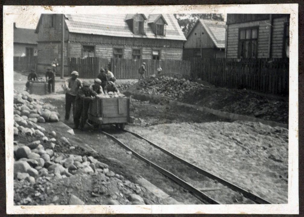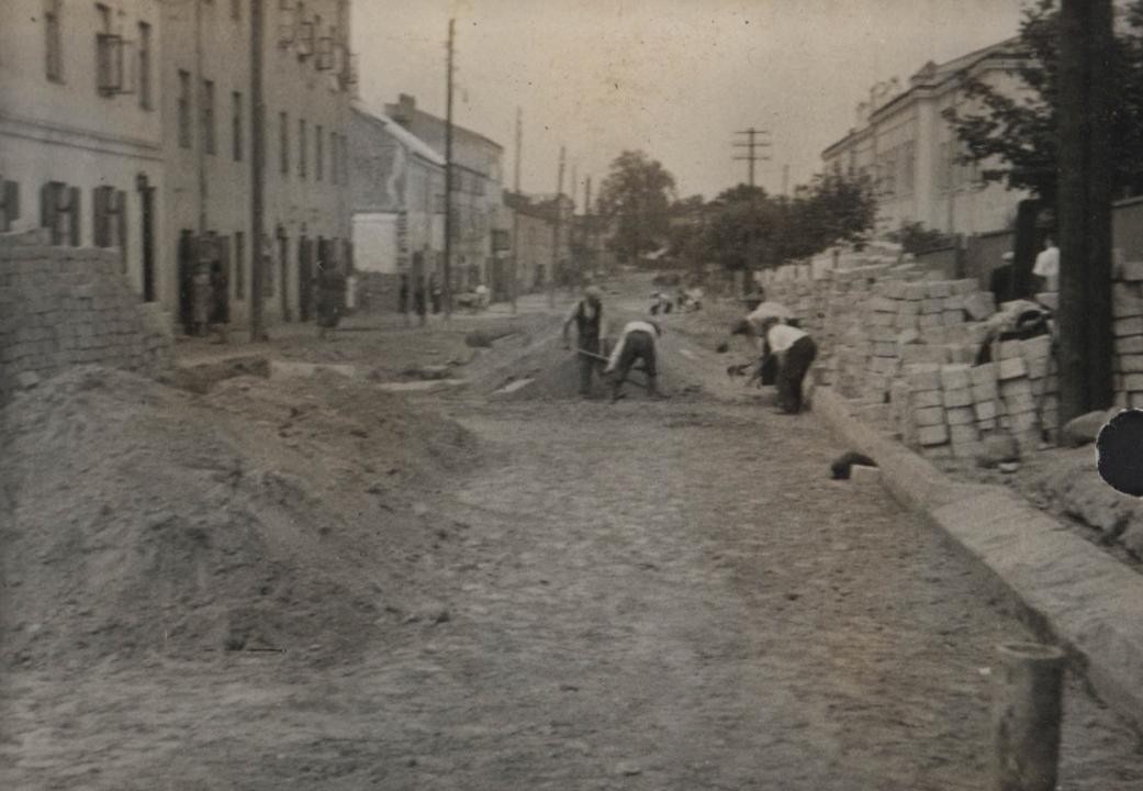 Utwardzanie drogi, najprawdopodobniej, w Radomiu w okresie międzywojennym (Miejska Służba Drogowa w Radomiu, sygn. 16)