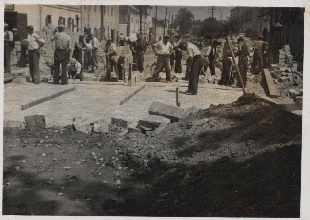 Prace brukarskie przy budowie wiaduktu w Radomiu w latach 30. XX w. [ul. J. Słowackiego] (Miejska Służba Drogowa w Radomiu, sygn. 16)