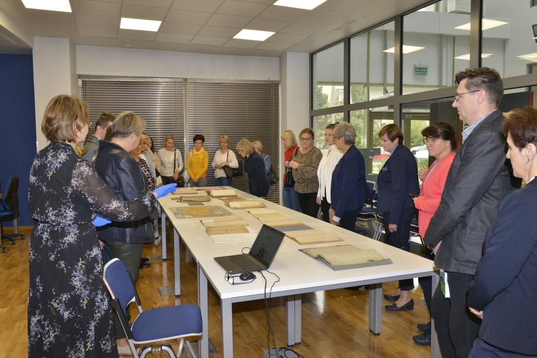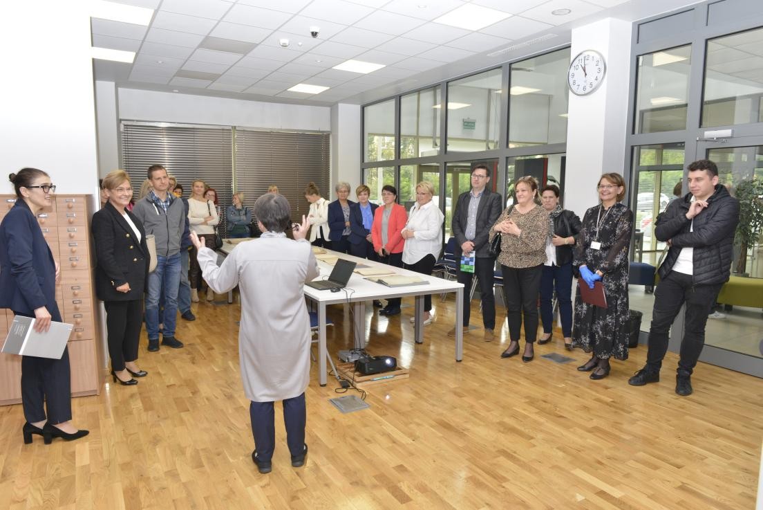 Uczestnicy poznali wszystkie etapy wędrówki materiałów: od pomieszczenia akcesji poprzez ewidencję, konserwację i digitalizację, aż do udostępniania w formie tradycyjnej oraz w serwisie www.szukajwarchiwach.gov.pl.